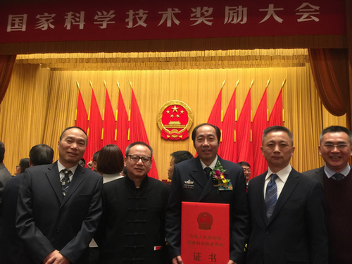 张卫东教授(中)、周俊杰总裁(右2)在国家科学技术奖励大会现场